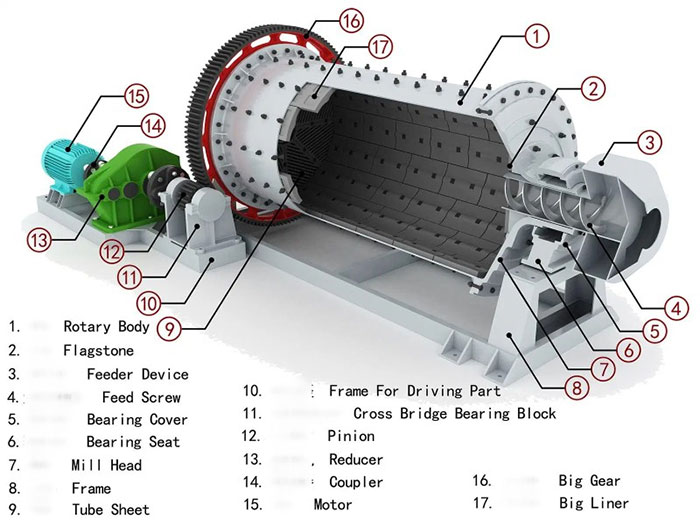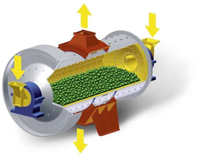 Máy nghiền bi gồm một thùng quay chứa bi thép bên trong với kích thước khác nhau, hoạt động quay tròn của thùng thông qua sự truyền tải bánh răng ở ngoài