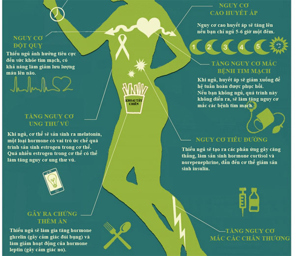Nguy cơ cao huyết áp sẽ tăng khi bạn chỉ ngủ 5-6 giờ một đêm. Thiếu ngủ làm gia tăng nguy cơ ung thư vú, trầm cảm, suy giảm khả năng nhận thức…